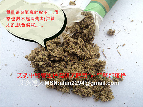 當年新艾為的綠色,1年內新艾為淺綠或咖啡綠,陳艾絨色土黃或金黃..越陳年的艾越接近金黃!